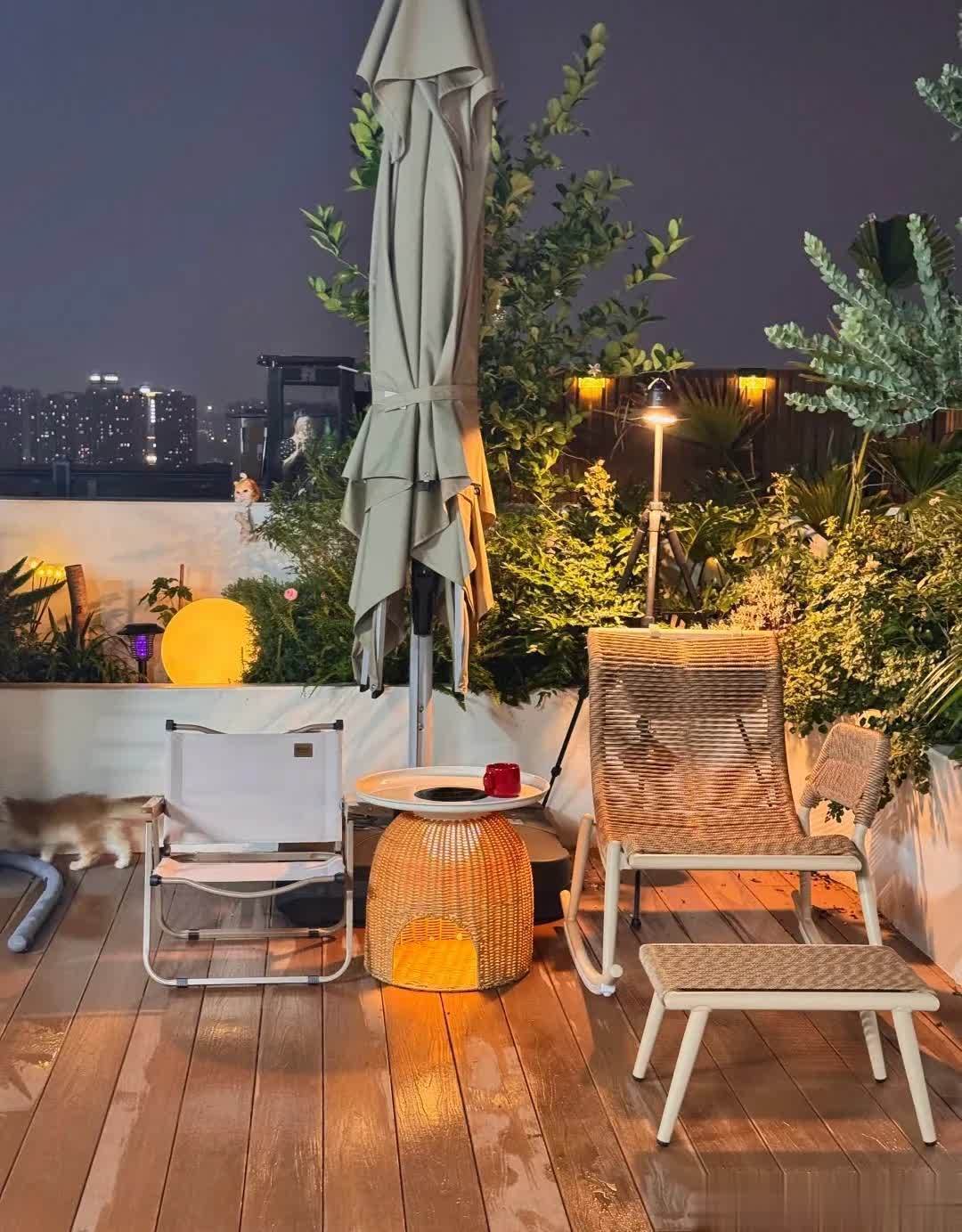 我花了两个月时间改造露台:一侧种上月季、绣球和多肉,打造出小花园;中间摆上藤编桌椅和遮阳伞,放上烧烤架;角落放一张躺椅和小边几,再挂一串星星灯。如今的露台,成了全家人的休闲天堂。