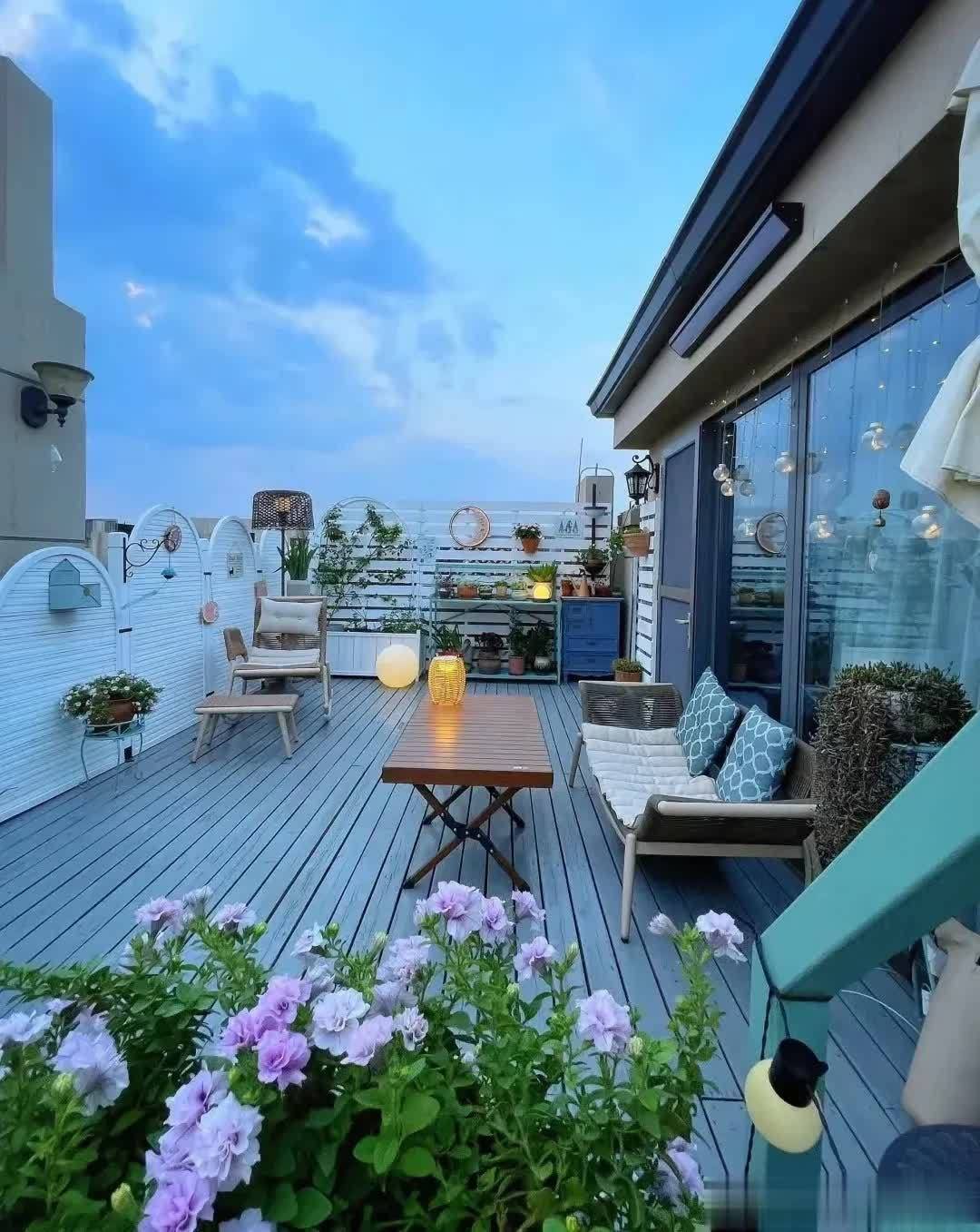 周末清晨,我会在露台上煮一壶咖啡,伴着花香读一本书;傍晚和老公一起烧烤、聊天,看夕阳慢慢落下;夏天的夜晚,关掉室内灯光,躺在躺椅上看星星,吹着晚风,一天的疲惫都烟消云散。网友@Gigi 也和我有同样的感受,她把露台打造成花园后,每天最期待的就是下班后和老公在露台喝茶休息:“在快节奏的生活里,能有这样一个慢下来的空间,真的太幸福了。”
