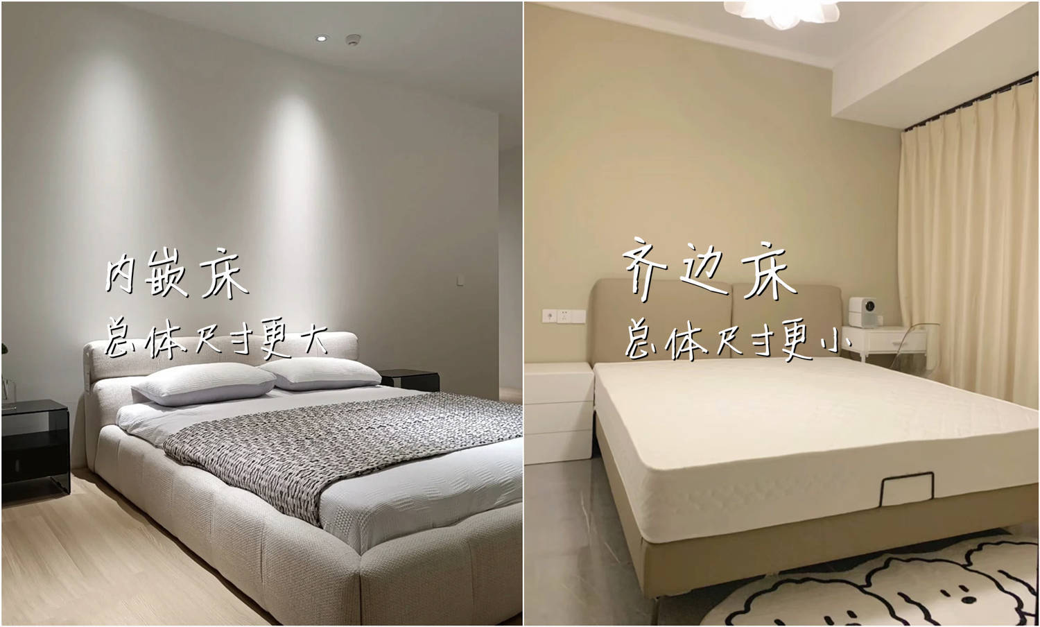 因为同样是1.8米的床,实际尺寸却大相径庭。因为款式上,还有个床垫内嵌床与齐边床之分、软靠床与硬靠背床之分,最大可差20-30公分。