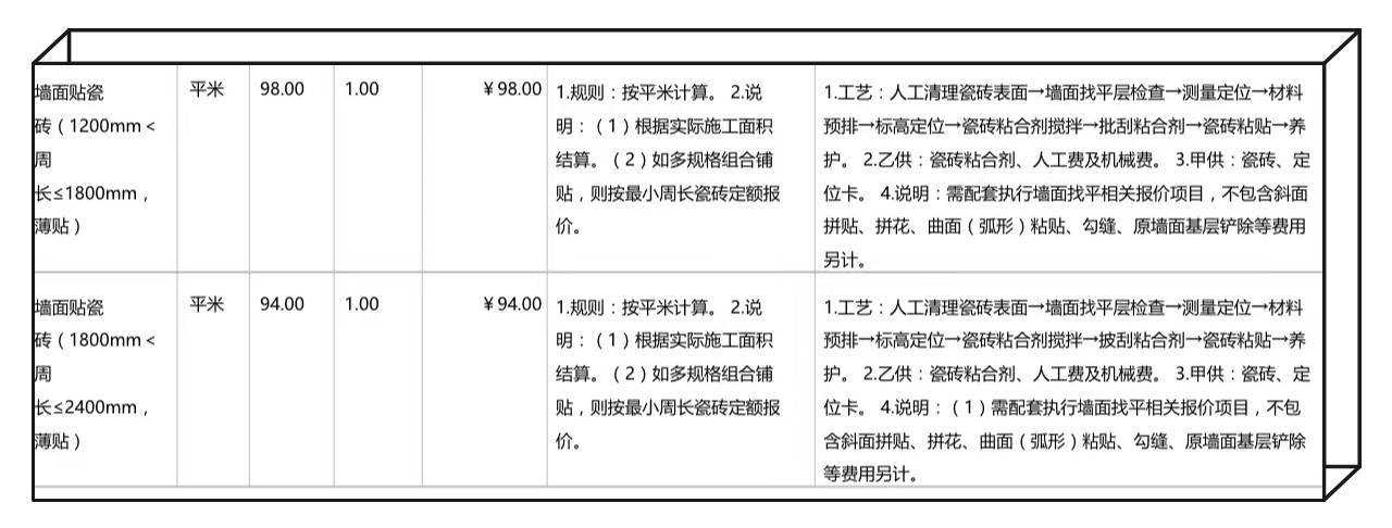 如图是所谓的业内最负盛名的上市装修公司给出的贴墙砖的报价,1200mm≤周长≤1800mm,也就是3060的墙砖,一平米是98元。