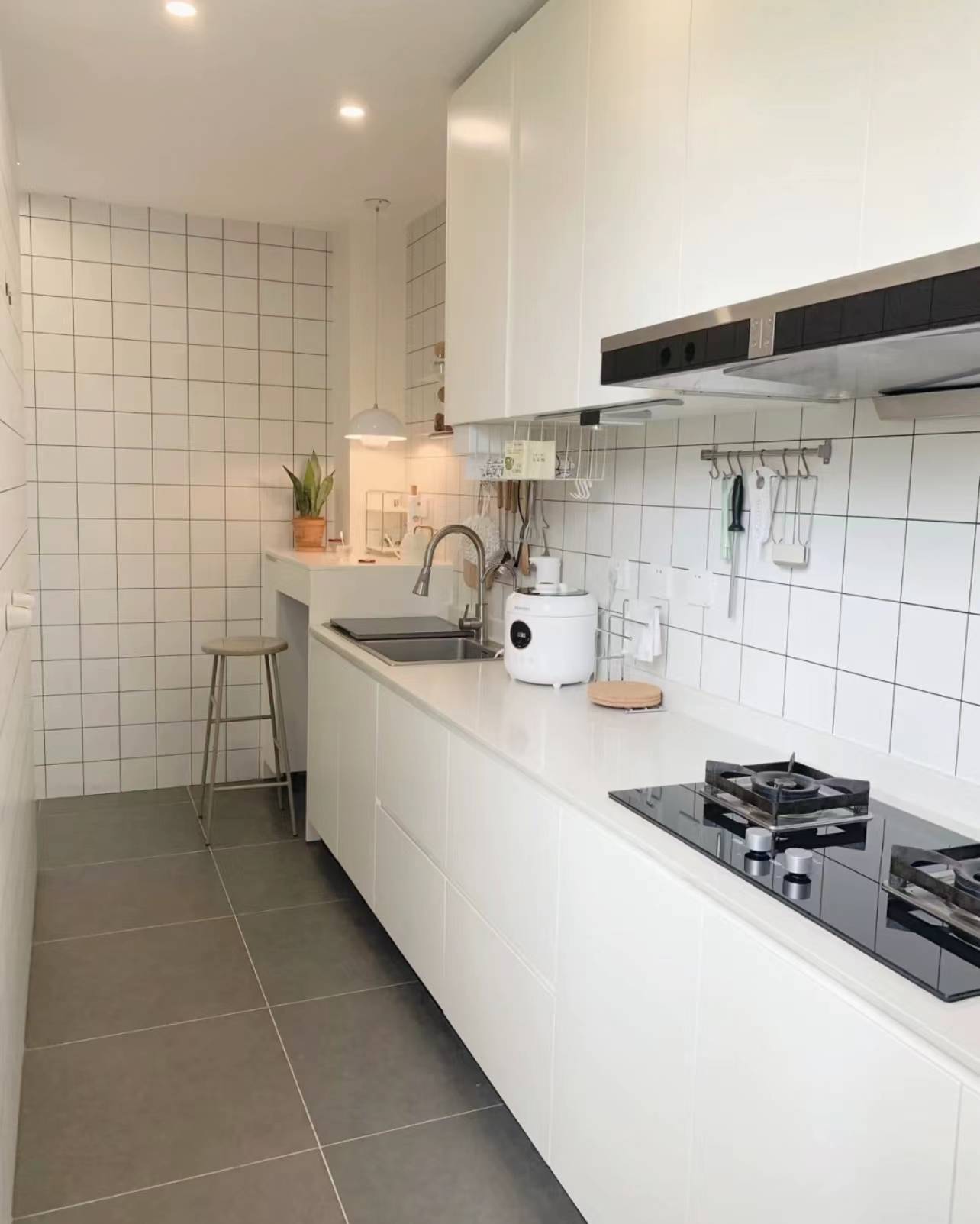 装修也确实要慎用这种小砖,因为厨房的8平米就用掉了2桶多的环氧彩砂,因为要美缝的米数,比两个卫生间的还多。另外贴砖时候,也给贴砖师傅加钱了。